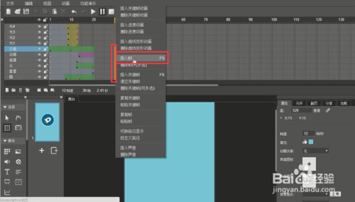 如下图,选中“火箭”至“圆”图层的第30帧,右键→“插入帧”
