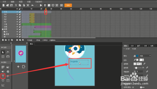 新建“文字”图层,在25帧“插入关键帧”,添加一个文本框,输入文字内容,调整大小、字体、颜色等属性