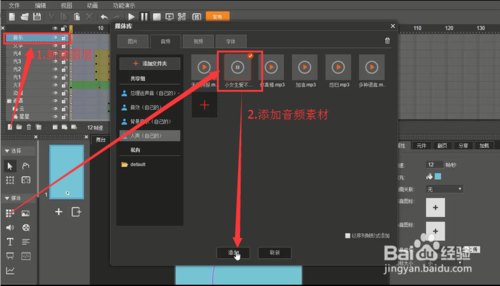 新建“音乐”图层,点击“素材库”选择添加所需的音频素材,点击“添加”,将音频图标移至“舞台”之外,在音频元素的“属性”面板下选择“自动播放”为“是”