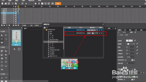 如下图,为“点击”图标添加“点击跳转到第3帧并停止”的行为。同时新建图层“行为层”,添加矩形,为其添加一个“出现即暂停”的行为。注意随时保存作品。