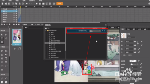 为第4帧的“返回”按钮添加“点击跳转到第3帧并停止”的行为。即为第一个人物素材设置好了提示出现和消失的动画,同理可为接下来的人物素材设置提示出现消失的动画。