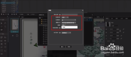 同理为“分享”素材组合添加“点击改变其左坐标为‘1000’”的行为,即点击将其移至舞台之外。
