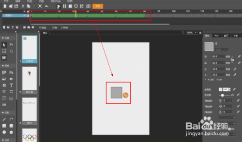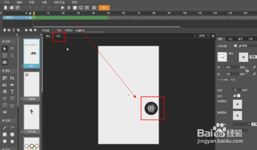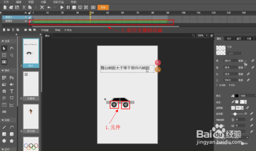将该元件放置舞台第1页(对齐小汽车元素合适的位置),同时在舞台上制作一个小汽车从左到右移动的关键帧动画效果