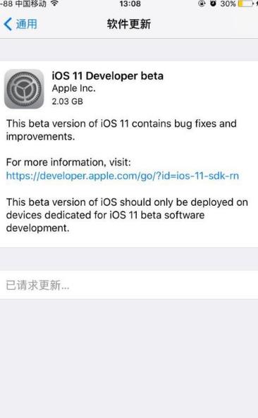 4、重启完成之后进入设置--通用--软件更新,这时便可以有iOS11开发者预览版Beta1的更新提示,点击下载即可自动下载安装。