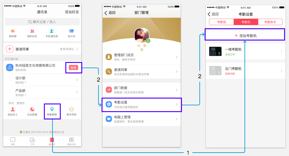 方式1:点击考勤管理→选择考勤助手Tab→点击添加考勤机