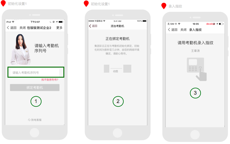 3.绑定成功,需要录入当前绑定者的指纹,作为考勤机管理员,手机端显示录入指纹页面,考勤机唤起设置指纹页面