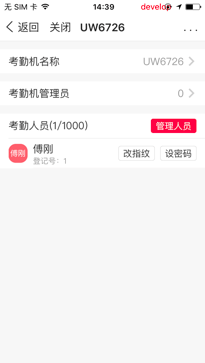 1.考勤机详情页面包括考勤机名称、管理员、考勤人员