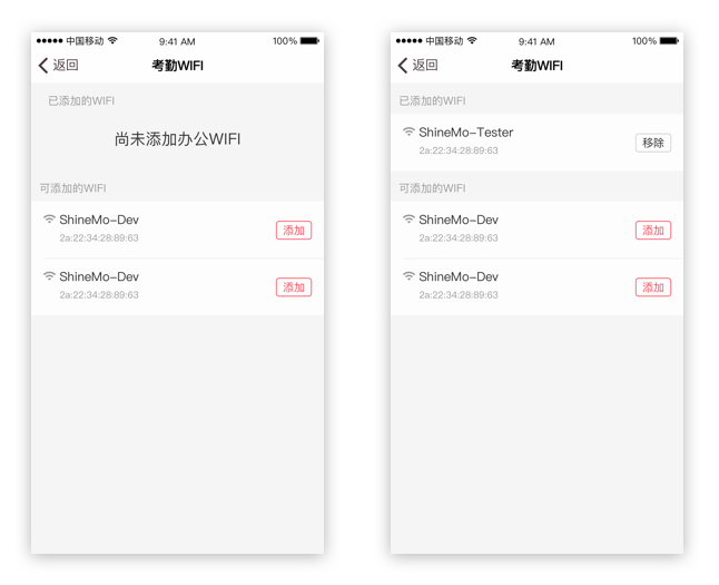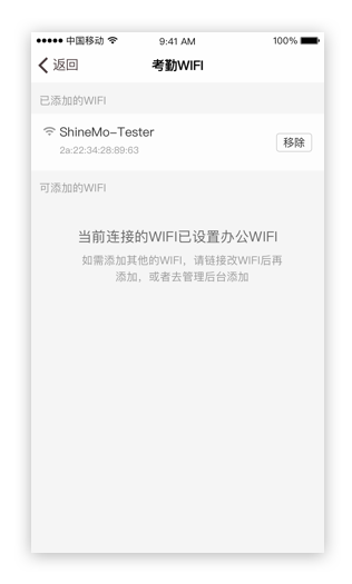 点击考勤WIFI,进入考勤WIFI,用户可以选择当前可以连接的WIFI设置为办公WIFI