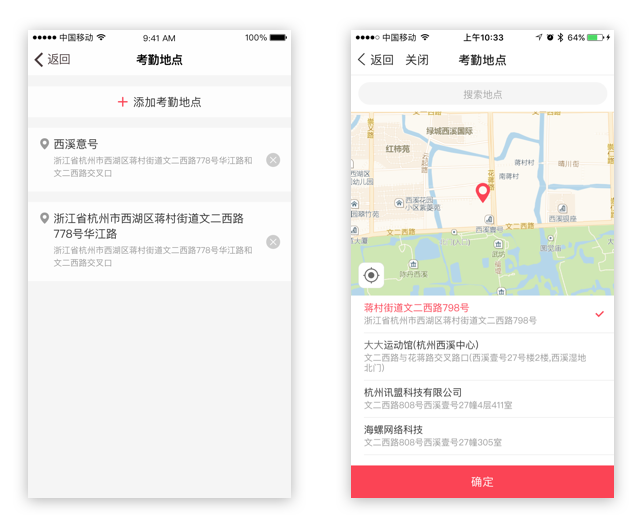 1.点击添加考勤地点,跳转到地图页面,默认显示当前地点,可以搜索选择地点,也可以拖动地图选择地点;