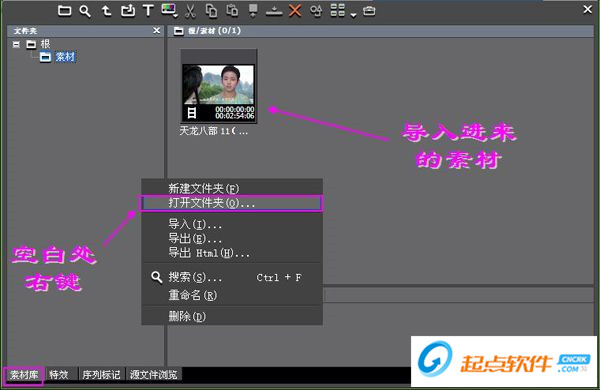 好啦,当这些准备工作都做好之后,我们就来导入视频素材吧,在右上角的素材库面板的空白处右键,选择打开文件夹,这个文件夹就是刚才我们放素材的文件夹啦,然后在右边就能看到导入进来的素材哦。