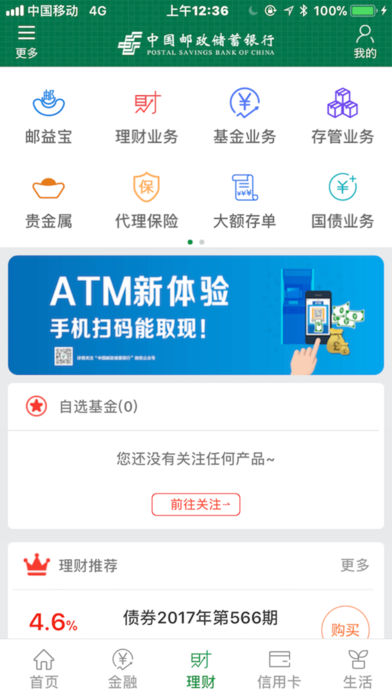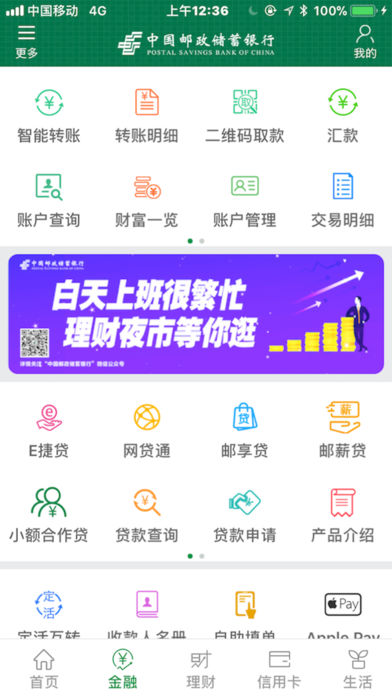 2.添加海量金融新功能。邮益宝,二维码,Apple Pay ,基金理财,让您足不出户,掌间操作各种金融业务。