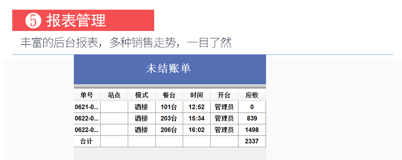 实时数据、日报、月报、年报、趋势分析、会员分析、菜品出品分析、收银分析、服务员工作量分析以及各种组合查询
