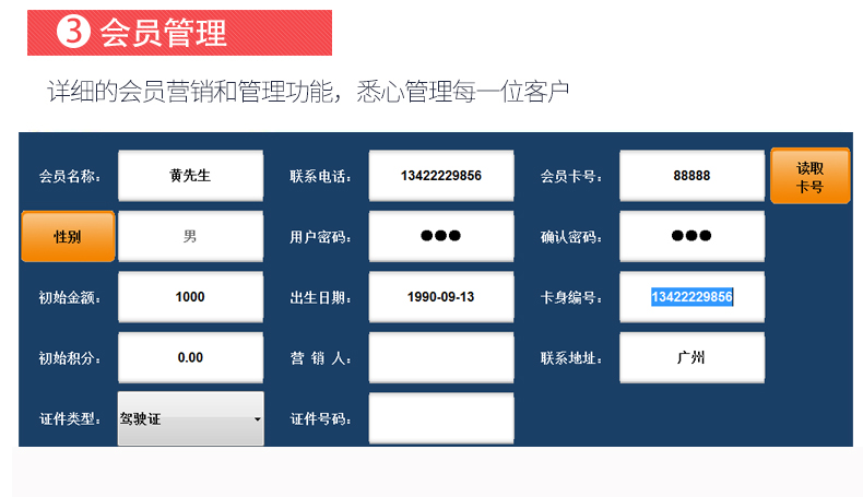 会员资料、会员类型、会员充值、会员消费、会员积分、会员关怀、积分兑换、会员充值查询、会员消费查询、会员短信、会员积分转星钻(金钻、银钻、铜钻等等)