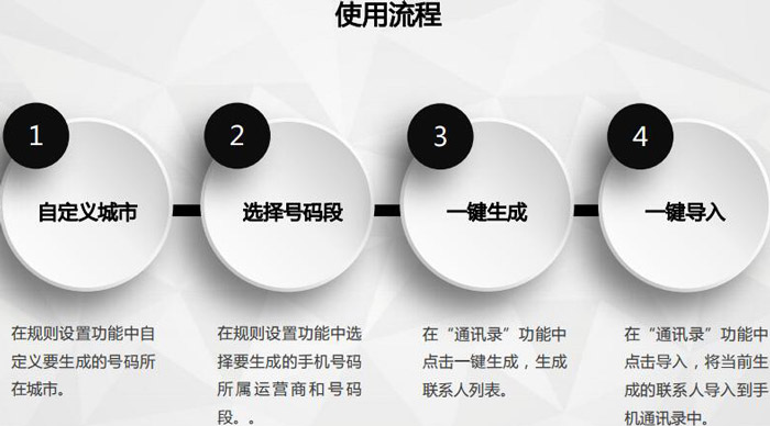 1、自定义全国城市和号码段2、一键生成/导入联系人