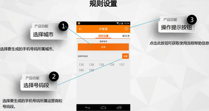 提供联系人数据库营销辅助功能,让营销工作基于海量手机潜在营销用户的数据库基础上开展,一键导入联系人,完全自定义城市和号码段,是打造精准营销以及o2o客源的有力辅助工具。