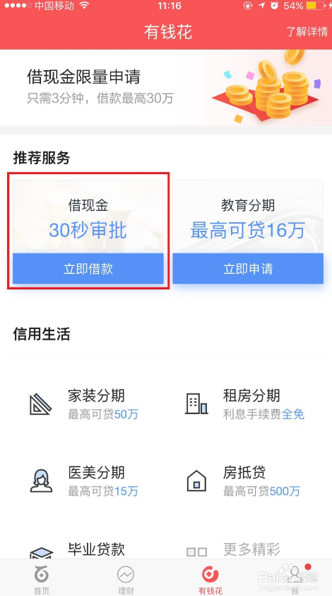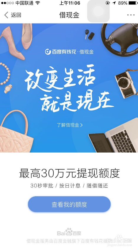 登录成功后,受到邀请的用户可以在百度钱包-有钱花,看到借现金的入口,点击借现金,在弹出的宣导页中点击“查看我的额度”;没有收到邀请的小伙伴也不要着急,大家可以在手机百度搜索 “百度借现金”,在搜索结果首位的百度借现金官方网站进行申请。