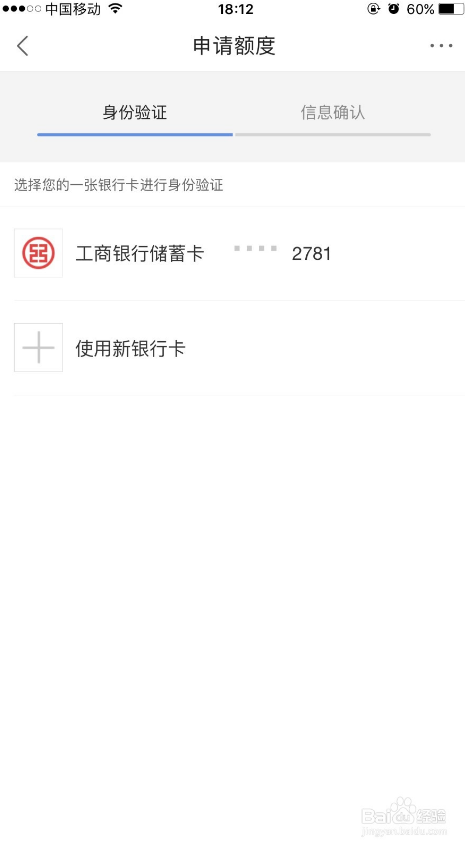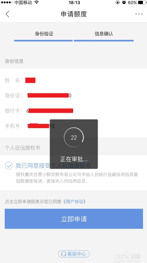 在弹出的界面中绑定银行卡并进行身份信息验证,小编之前用过百度钱包有绑定卡,没有绑定过银行卡的朋友需要绑定一张卡。填好信息后, 30秒出现审批结果获取借款额度。
