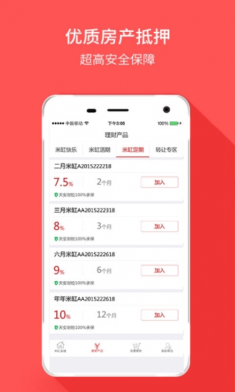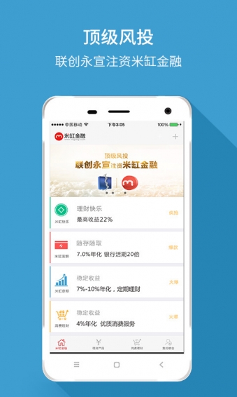 米缸金融是一款非常专业、安全的投资理财软件,该软件为用户精选了多种理财产品,让您坐享稳定收益,还有专业保险公司承保您的本金及收益的安全,让您的投资更加省心省力。