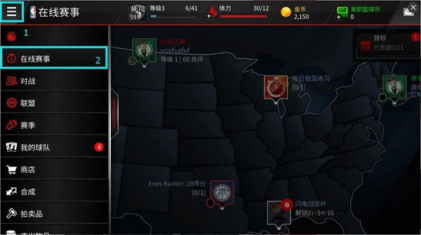 Enes Kanter:28分赛事攻略在游戏主界面点击最左上角的“1”处按钮,然后再点击“2”处的“在线赛事”按钮即可打开在线赛事界面