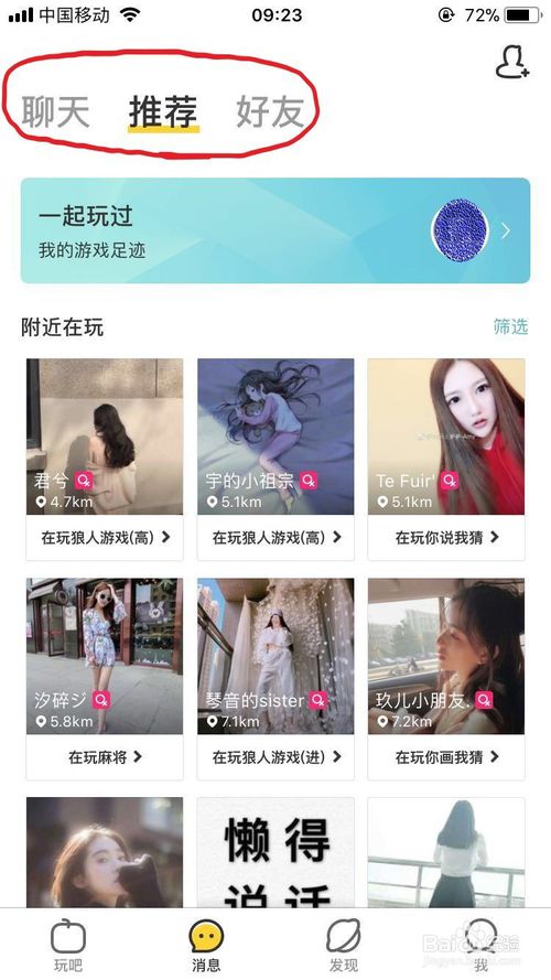 2、在界面最上方,可以看到聊天、推荐、好友。倘若我们已经加了好友,那么就可以直接到好友界面中去找。如果没有加好友呢,点击推荐按钮,找到【一起玩过】。