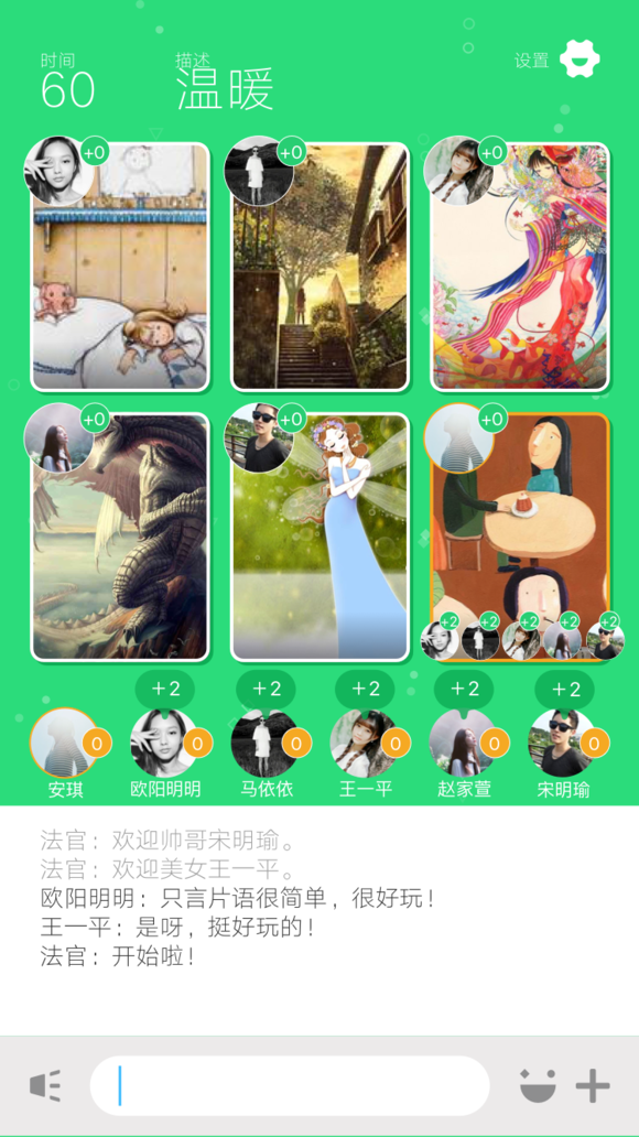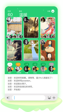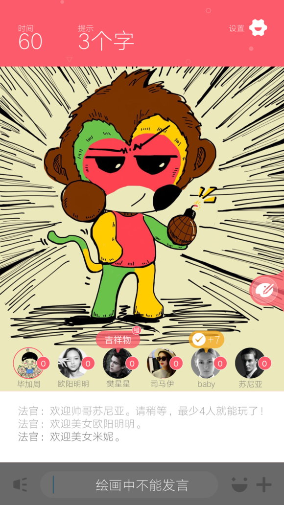 参考法官的提示尽快回答,将获得高分。画画的人被猜中的越多,分越高,但是所有人猜中就不得分了。