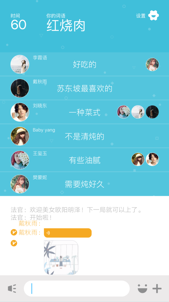 游戏开始后,系统随机出几个词,首先由第一个位置的人(说词人)选择一个并对该词进行描述(只有说词人可以看见词),其余玩家则可以根据简要的提示来进行猜测,每个词的猜测时间为130秒。