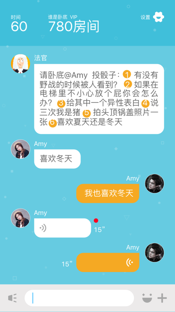 任何游戏结束之后,输的玩家进行真心话大冒险。法官会提出问题,由输的玩家投骰子(骰子在输入框的加号区里面)或直接进行做大。
