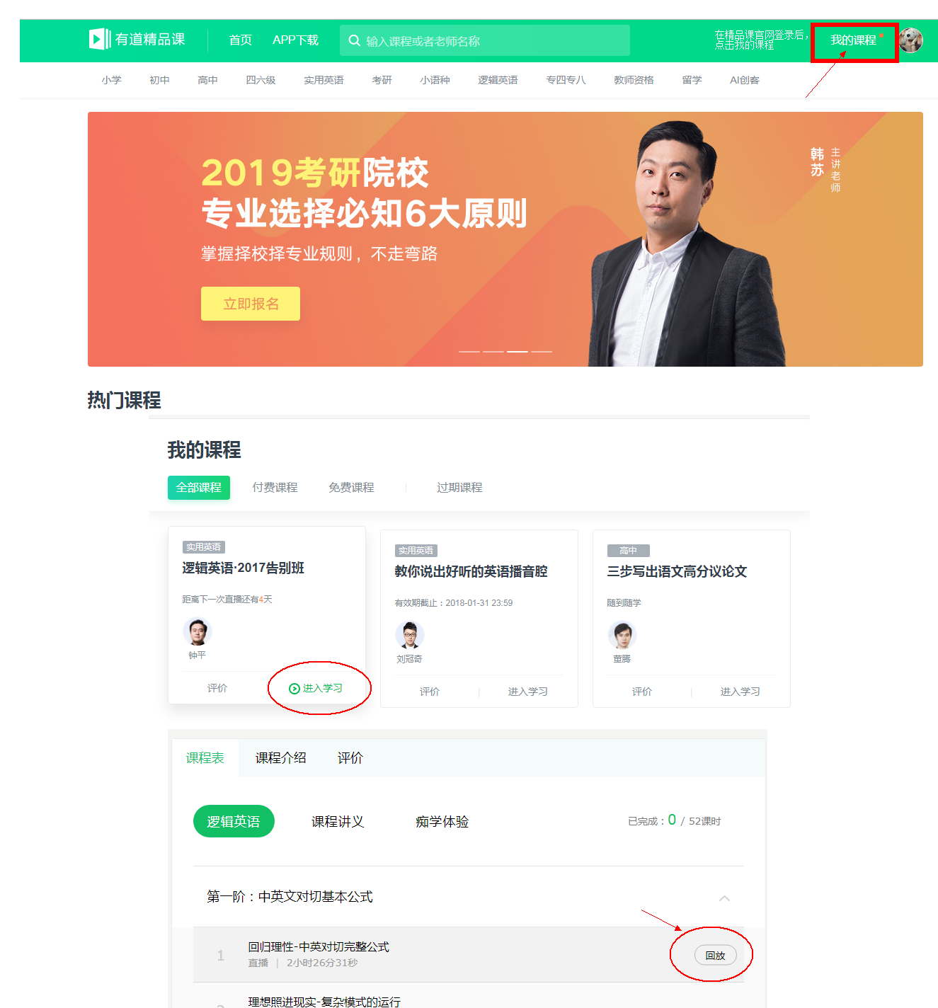 手机端:下载有道精品课app,登录后在“我的课程”下,按照课程表提示的直播时间,点击“进入直播”