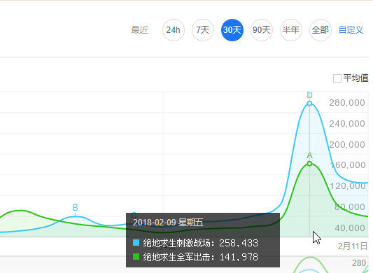 2、在公测之前,《全军出击》与《刺激战场》在百度搜索指数的数据体现上有一段时间差距不是非常明显,而在2月9号正式公测日,产生了明显的差距(2月12日查询),蓝色曲线为《刺激战场》2月9日近26万的搜索指数,绿色曲线为《全军出击》2月9日近14万的搜索指数。