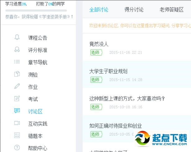 高校邦教学主要是章节学习,每一章节末尾会有小测试或讨论,也会有一定的作业和期末考试,课程的新信息和讲师的特别提示什么的都在这里,我们也可以直接给老师留言。