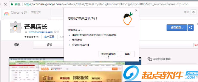 1.首先,需要下载安装芒果店长插件,如果可以方法chrome应用商店就选择在线安装,如果不能访问就从我们chrome插件网下载。离线安装chrome插件的方法参考:安装过程中出现如下图示,点击添加即可。