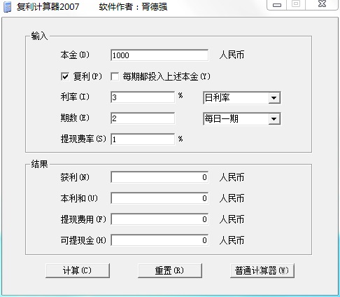 这款复利计算器可以严格按照最新复利计算公式准确无误的计算现值复利,复利的计算是考虑前一期利息再生利息的问题,要计入本金重复计息,即“利生利”“利滚利”。追加期初投资复利计算器所采用的是复利计算公式进行计算复利现值,期初投资允许第二个期限初追加投资,比如第二年,你可再投入多少元,不追加时,可不填写。 在收益率处选择期限类型(年度/季度/月度)和输入该期限下的利率。如果计算的期限超过30,可以把30期限后计算的期末总资产再填入期初投资,计算余下的期限。