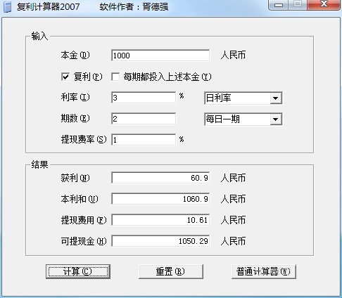 复利计算器是一款简单实用的投资收益计算工具,用户可以在定投复利计算器中输入本金、利率、期数、体现费率来计算出获利、本利和提现费用、可提现金等信息,让你投资收益更加清晰明了。包括的维度有本金、年利率百分比、年期、最终结果以及其中的利息,快速计算活期、定期投资收益。