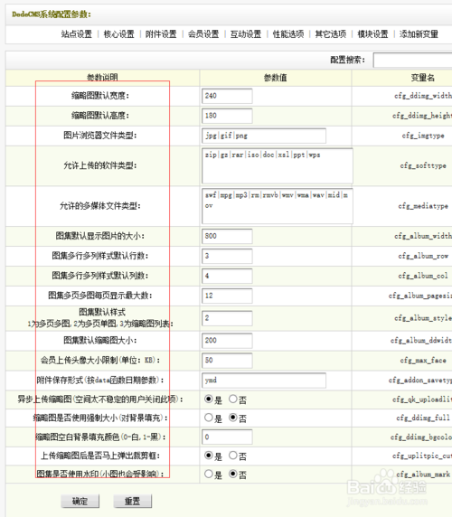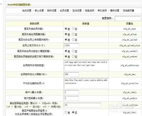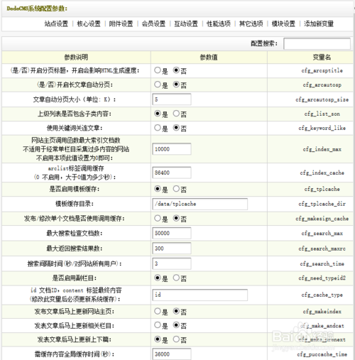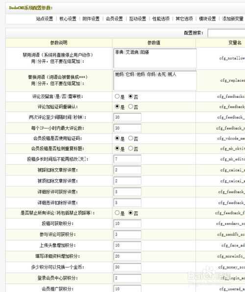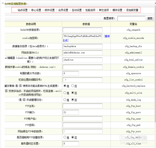 进入网站后台【DedeCMS系统配置参数】页面,此时页面导航卡分别为:【站点设置】、【核心设置】、【附件设置】、【会员设置】、【互动设置】、【性能选项】、【其它选项】、【模块设置】、【添加新变量】。