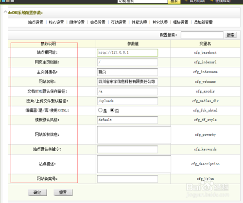 【站点设置】页面-首先我们看到【参数说明】、【参数值】和【变量名】,【变量名】主要是在织梦模版里面做调用之用。【站点根网址】可以填入:http://127.0.0.1和域名网址。