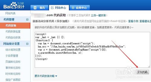 首先我们要到百度统计里把百度统计代码拷贝下来,如下图所示。