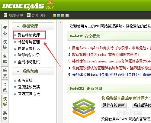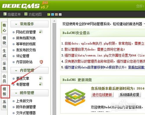 成功登录织梦后台后,点击后台左侧导航上的模版选项,如下图所示。