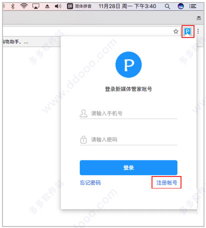 一、登录新媒体管家帐号点击插件图标,输入新媒体管家帐号;如果没有帐号,请先注册。