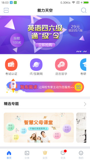 能力天空是一款专为考研升学推出的学习教育软件。学生可以根据学习需求,快速选择课程类型,便捷观看课堂直播,学习丰富的学科知识,同时还可以随时在线考试测评,检验学习成果,以便及时归纳知识点巩固复习。