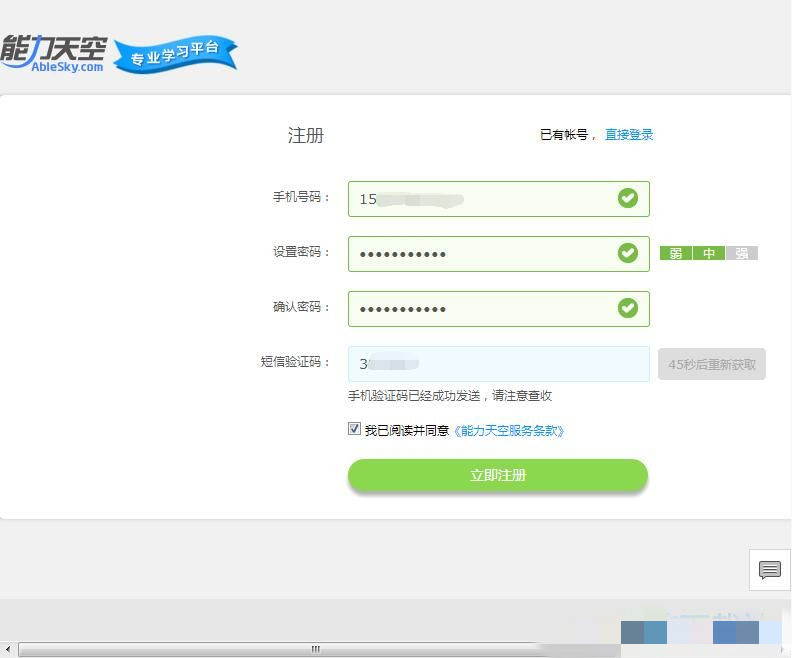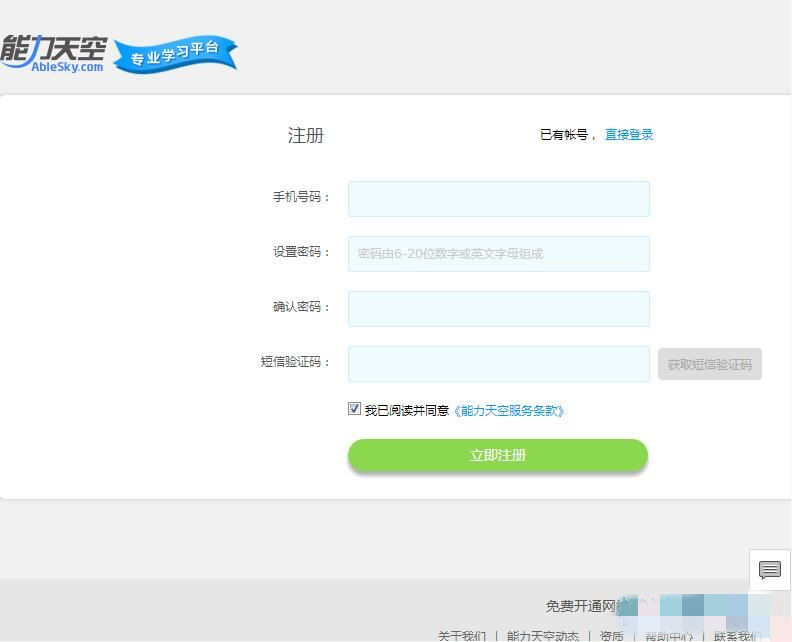 要注册能力天空账号,我们要输入手机号码、设置密码、确认密码、短信验证码;