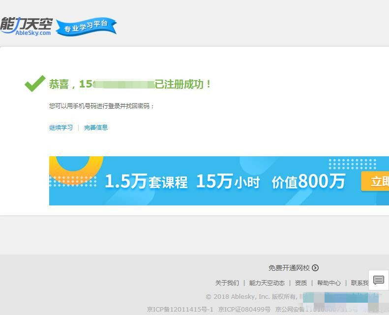 能力天空账号注册成功,这时候网页会提示账号注册成功。