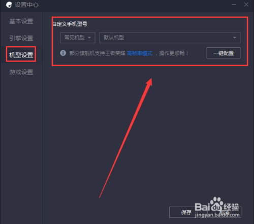 进入到设置页面后选择设置中心按钮,设置中心里面有机型设置,引擎设置,游戏设置等操作。