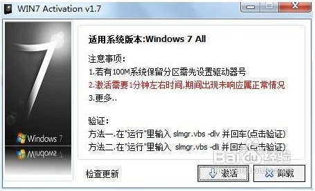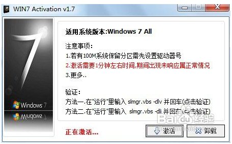 运行WIN7Activation后,点击软件主界面上的“激活”,进入激活状态