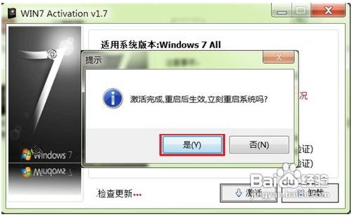激活完成后,WIN7Activation会提示重启电脑,按照提示点击“是”重启电脑