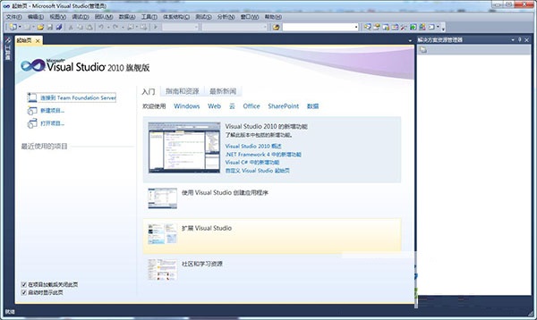 Visual Studio 2010 起始页具有新外观和新功能。选项卡式内容区域可链接到各种选定和分类学习资源。这包括 MSDN 资源、社区资源和可自定义的新闻源。通过改进的“最近的项目”列表,只需单击鼠标便可在该列表中添加或移除项目。还可以从扩展管理器安装自定义起始页。