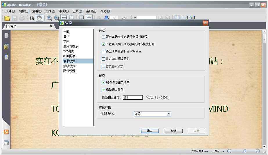 在“阅读设置”中,选择“设置半页标志”,则Apabi Reader 在半页翻状态中显示出蓝色标志线。缺省采用“平滑字体”,文字显示清晰无矩齿。 在“文件设置”中,选择“使用网络文件”,可在线阅读比较大的 CEB 文件(支持 HTTP 和 FTP 协议)。可设定网络文件的最小尺寸(若文件小于该尺寸,则不采用网络文件方式;且最小尺寸设置一定是整数)。