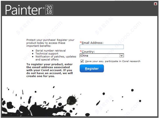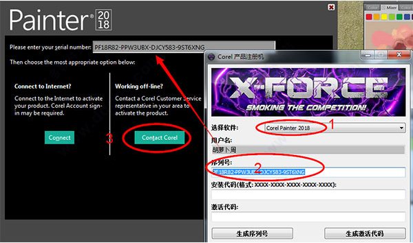 8、打开安装包下的Painter 2018注册机,选择版本为“Corel Painter 2018”,将序列号输入到选项中,然后点击“Contact Corel”