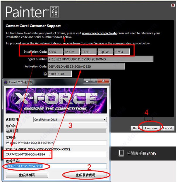 9、然后将“Installation Code”项中的机器号复制到注册机中,点击“生成激活代码”,然后将激活码复制到注册窗口,点击Continue完成破解。