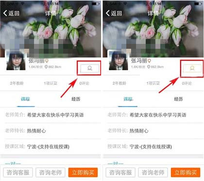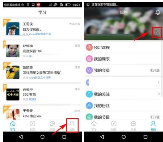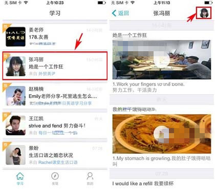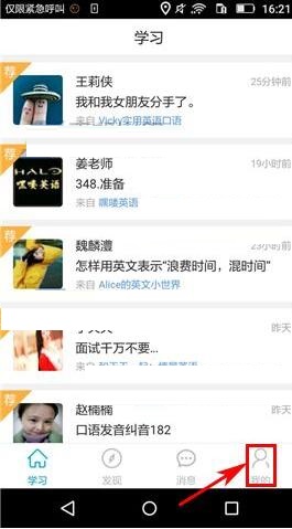 1、打开掌中英语,进入主页面选择【你想收听的人】,进入她的动态后点击右上角的【头像】。(如下图)