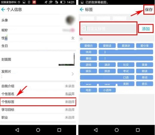 2)点击下方的【个性标签】,然后点击下凡的编辑框输入标签,接着点击旁边的【添加】,最后点击右上角的【保存】即可。(如下图)
